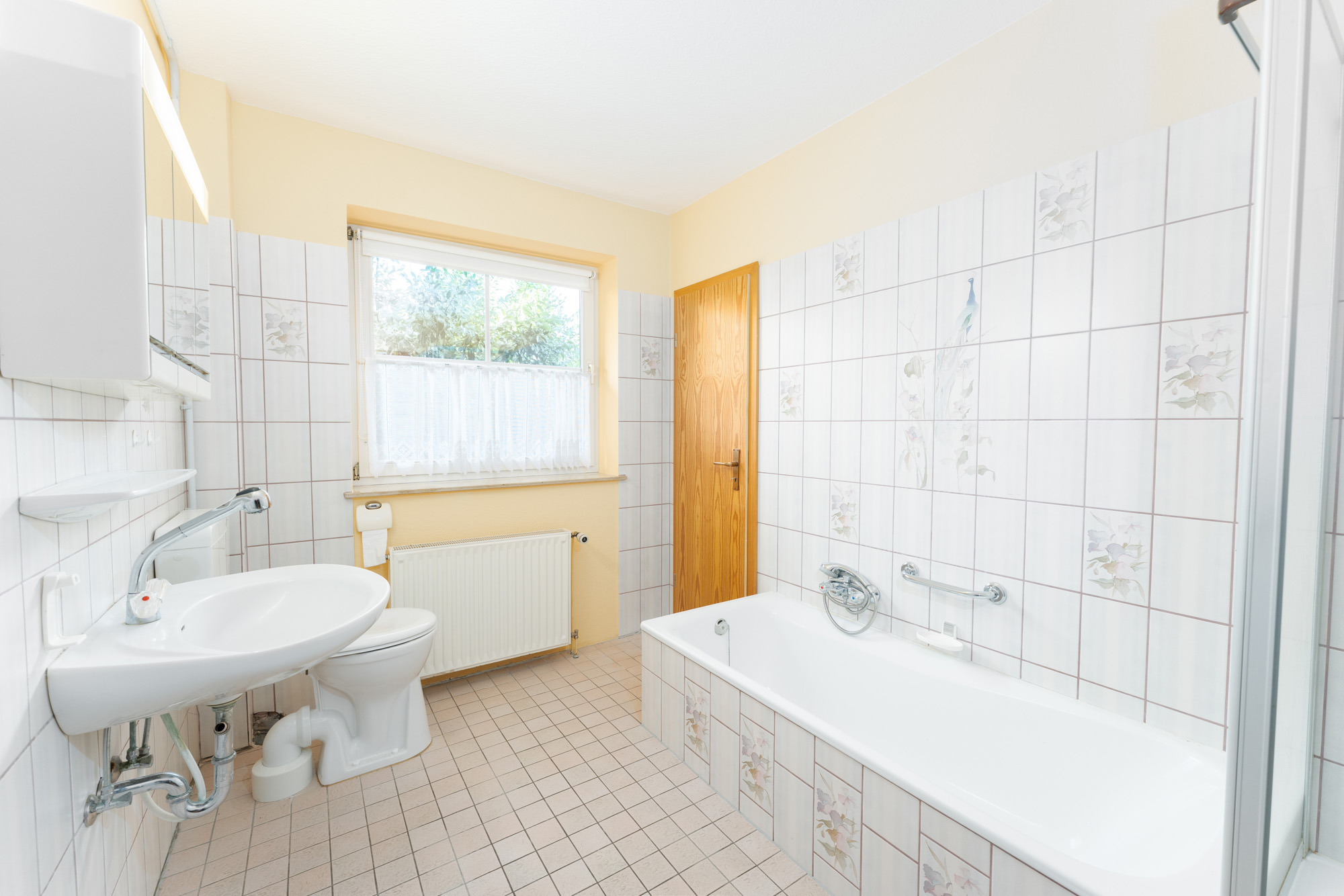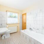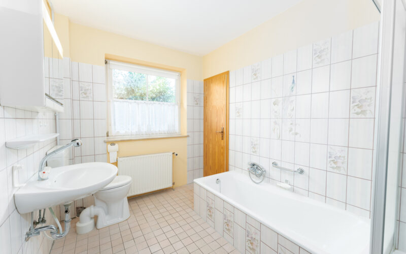 Komfortabel ist der direkte Zugang zum Badezimmer. Das hell geflieste Tageslichtbad verfügt über eine Dusche, Badewanne und den Wasseranschluss für die Waschmaschine.