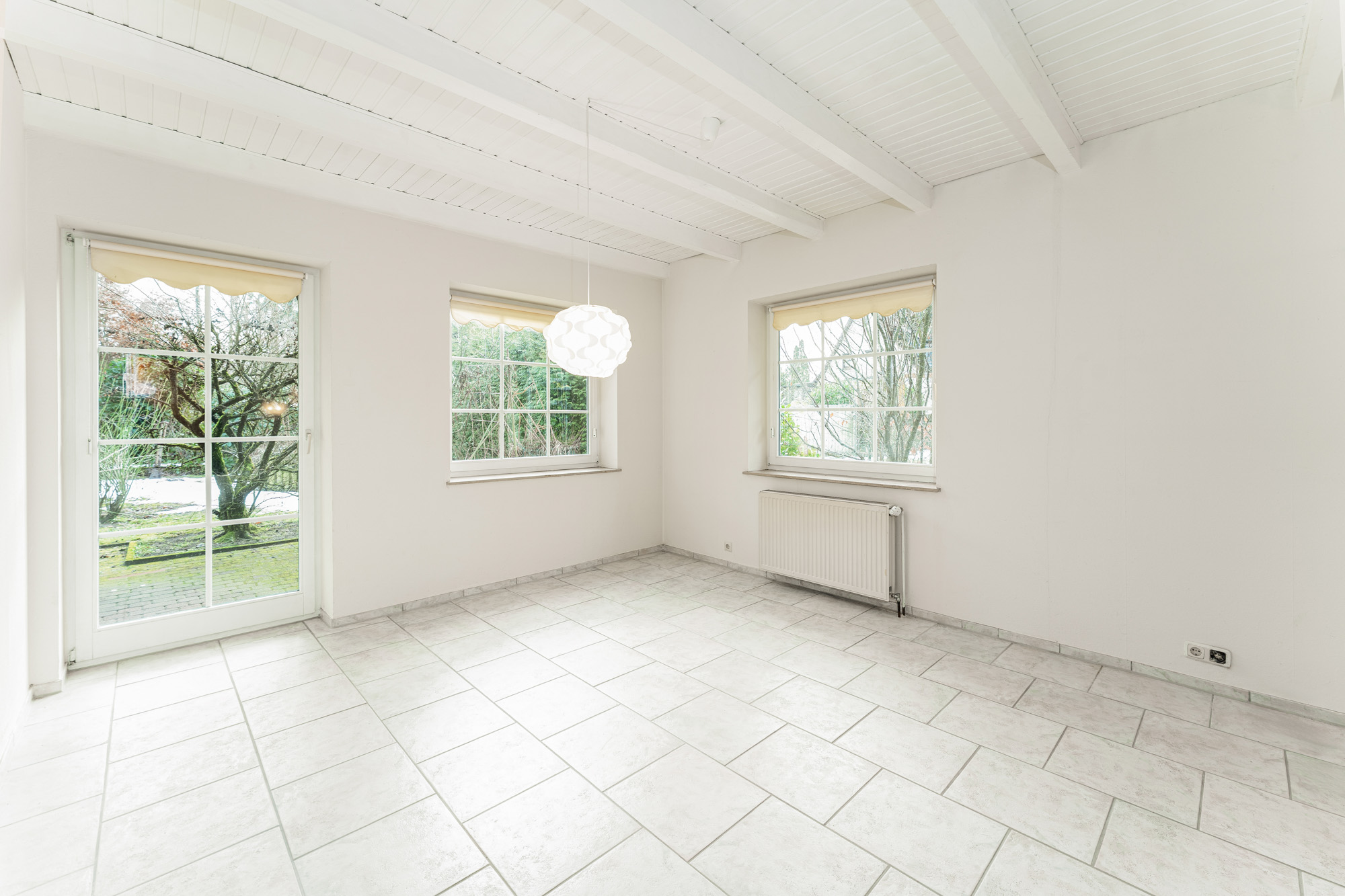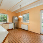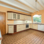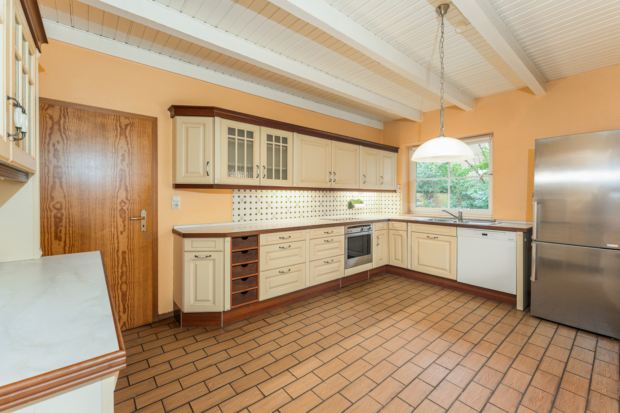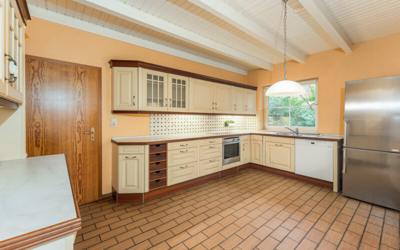 Die Küche mit zeitloser Einbauküche öffnet sich zur nach Süden ausgerichteten, großzügigen und teilweise überdachten Terrasse. Von hier aus genießen Sie einen schönen Blick in den Garten, der vielfältige Möglichkeiten zur individuellen Gestaltung bietet, sei es als Rückzugsort zum Entspannen, als Spielfläche für Kinder oder als grünes Refugium, in dem man die Seele baumeln lässt. Gerade an lauen Sommerabenden wird dieser Bereich schnell zum Mittelpunkt des Hauses.