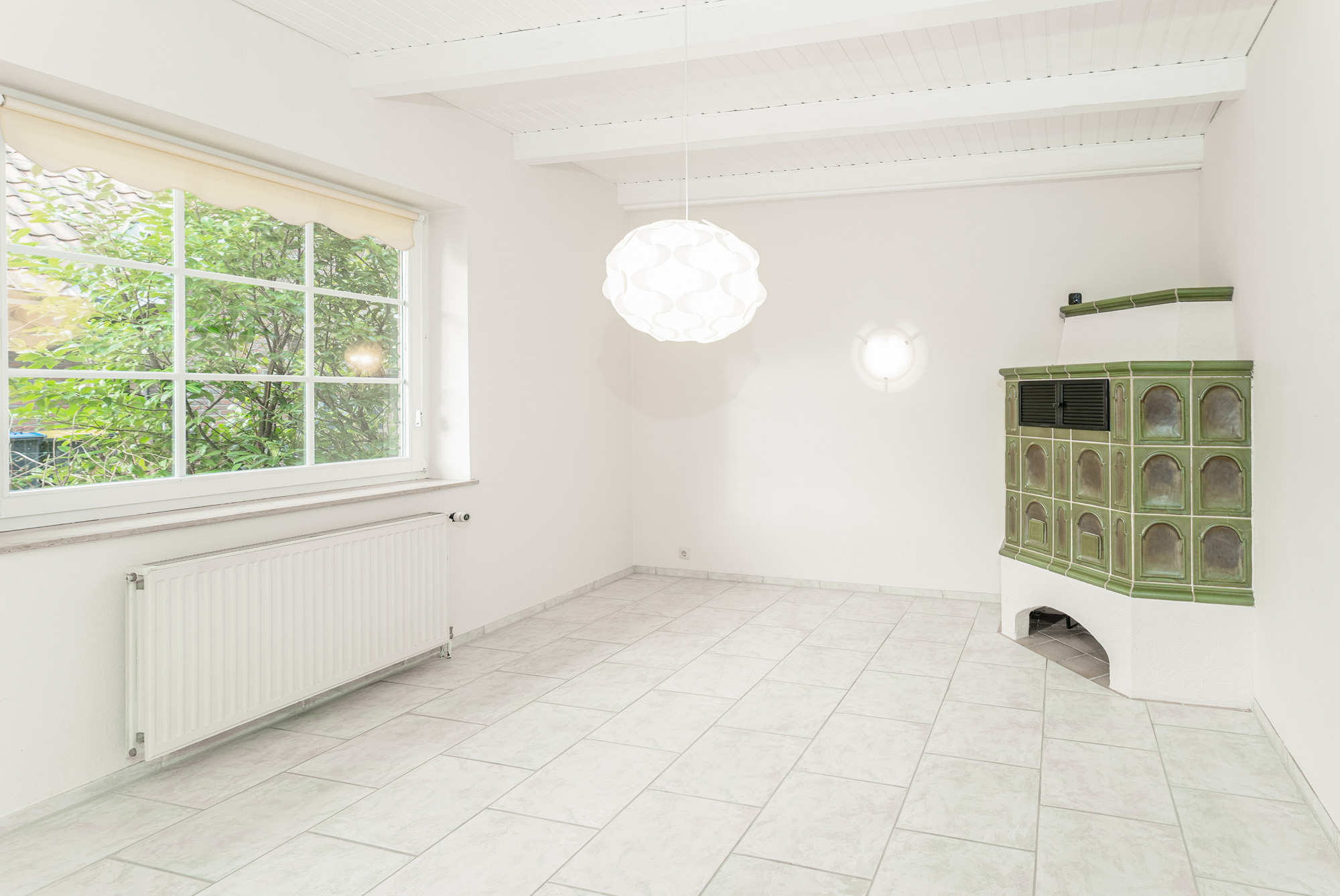 Im Wohnzimmer befindet sich der behagliche Kachelofen, das Herzstück des Hauses, das für gemütliche Stunden, Begegnungen und Entspannung sorgt. Besonders praktisch: Der Kachelofen wird im Flur befeuert, sodass sich die wohlige Wärme gleichmäßig im Erdgeschoss verteilt und die Energiekosten nachhaltig gesenkt werden können.