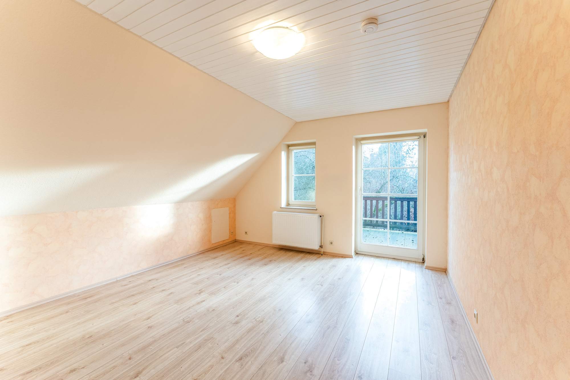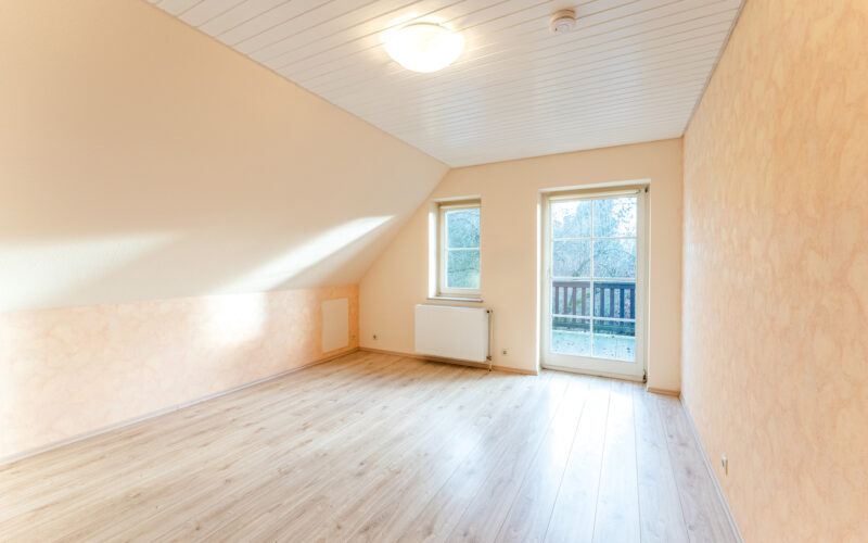 Ein Badezimmer mit Dusche ergänzt diese Ebene funktional und stilvoll. Ein besonderes Highlight ist der große südlich ausgerichtete Balkon, der von zwei Zimmern aus zugänglich ist und einen freien Blick in den Garten eröffnet, ein wunderbarer Ort für den ersten Kaffee am Morgen oder einen ruhigen Moment am Abend.